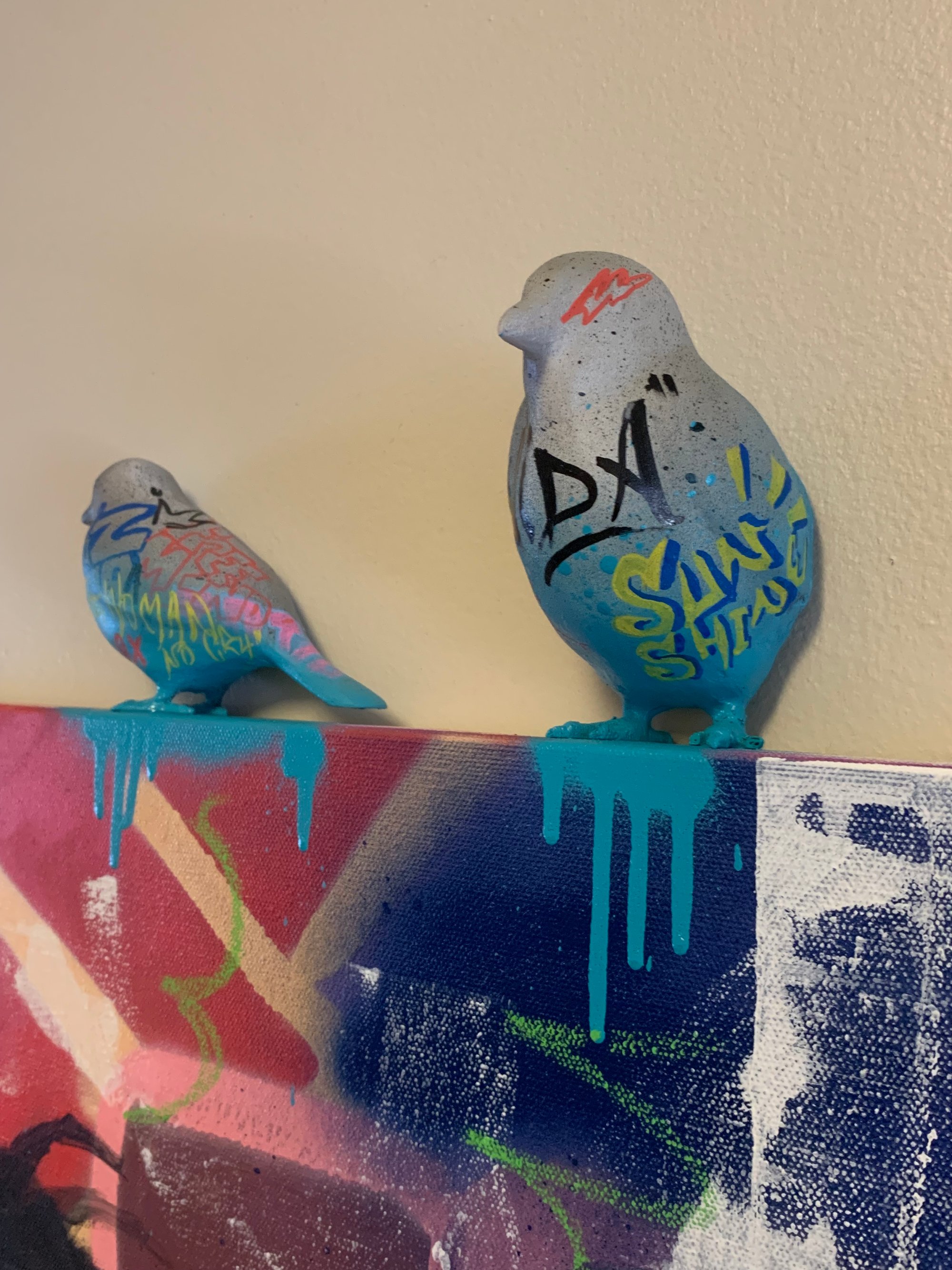 With a grayscale portrait at the center of a vibrant graffiti-style background, this piece captures the energy of resistance and harmony. The three birds two perched above and one resting on his hand bring the lyrics to life, whispering: